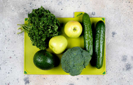 Healthy vegan food diet concept. Green vegetables and fruits on green cutting board on concrete table background. Top view, flat lay. Cooking concept.