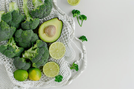 Cotton mesh bag with fresh broccoli, avocados and limes. Eco friendly shopping and healthy lifestyle concept. Generative AI illustration