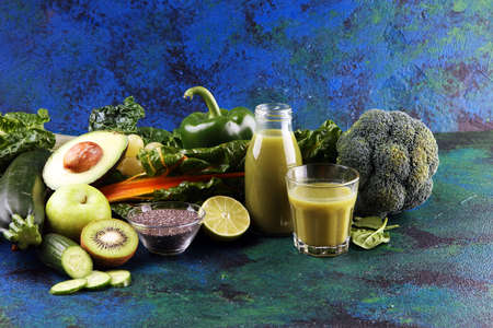 Healthy green smoothie and ingredients - detox, diet, health, vegetarian food concept with vitamin