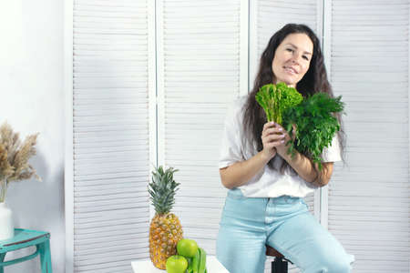 A smiling woman with vegetables and fruits. Pineapple, apples and celery. The concept of spring and vitamins. Detox food. Front view.