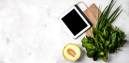 Tablet computer and shopping paper bag with fresh organic vegetables. Top view Copy space Banner