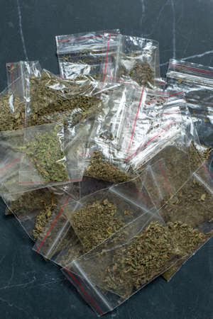 crime evidence: many packaged doses of cannabis lie on a dark surface