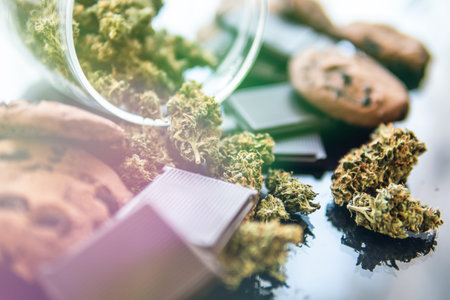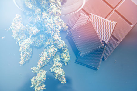 Cannabis CBD herb Chocolate and Cookies. Cookies and Chocolate with weed and buds of marijuana on the table. Treatment of medical marijuana for use in food, yellow background. light leaks