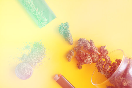 Flat lay of smoking weed accessories. THC use in healthcare.