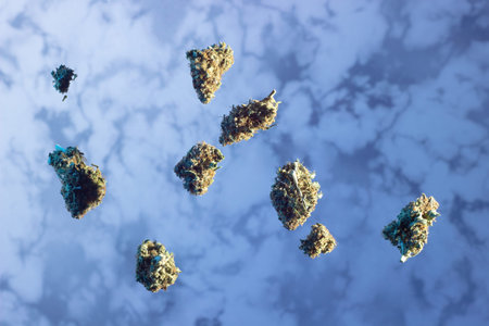 Dry buds of medical marijuana levitate against a marble background in blue lighting. The background looks like a sky with clouds