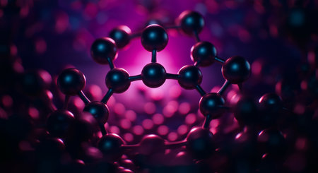 Dark glossy molecular bonds and spheres against a moody, textured background with soft light.