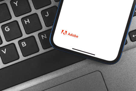 Kharkov, Ukraine - May 28, 2021: Adobe logo on the screen and background of the laptop keyboard