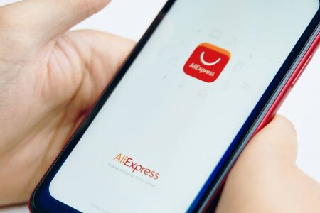 Bishkek, Kyrgyzstan - June 5 2019: Iphone in hand. Aliexpress application on Apple iPhone X smartphone screen. Close-up.