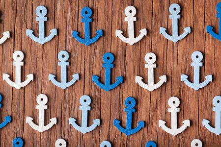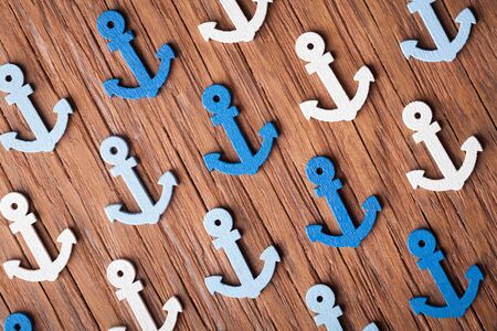 Background with decorative anchors and wheels on a white painted background. Place for text. Top view with copy space.