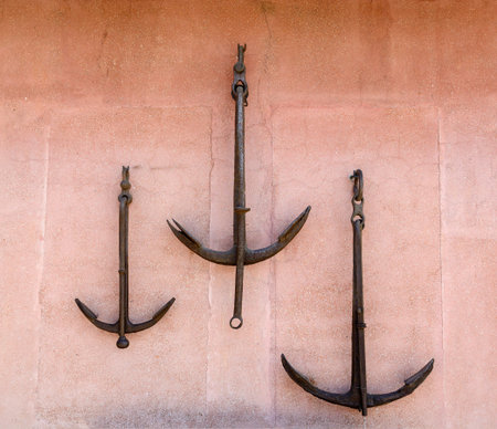 Three old rusty iron anchor hanging on the plastered wall burgundy
