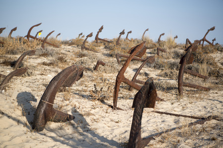 The arrangement of anchors memorial to the lost tuna fishing industry that once thrived there and were used to keep the nets in place as opposed to mooring the boats at the Anchor Graveyard in Praia do Barril, Tavira, Portugal