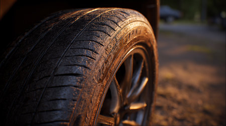 Tire close-up from a low angle on a rural road, with sunlight casting shadows on the tread and surface.