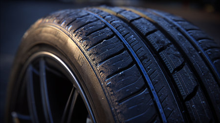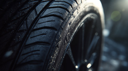 A striking close-up image showcasing the intricate texture of a wet tire tread, illuminated by soft light. The photo captures the unique patterns and reflections, emphasizing the tire's detailed design and rubber material. Perfect for automotive themes or backgrounds related to vehicles and travel.