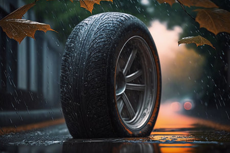 Wet tire splashing on rainy road. Concept highlights vehicle safety in rain
