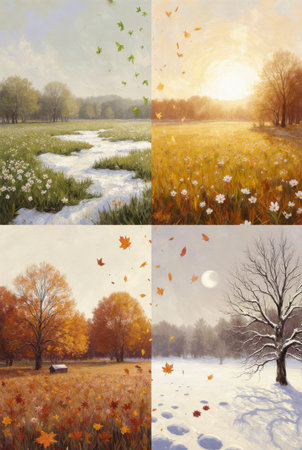A captivating illustration showcasing the four seasons, featuring a snowy winter scene, a blooming spring landscape, a sunny summer view, and a colorful autumn display in nature.