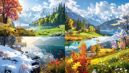 Stunning mountain lake views across four seasons. A breathtaking panorama of nature's beauty.