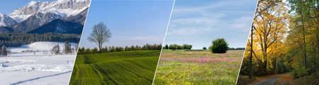 Four seasons landscape collage. Horizontal banner with photos of winter, spring, summer, autumn.Landscapes od mountains, field, meadow and forest in all seasons.