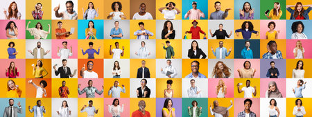 Happy Multiethnic People Grimacing And Gesturing Over Colorful Backgrounds, Collage
