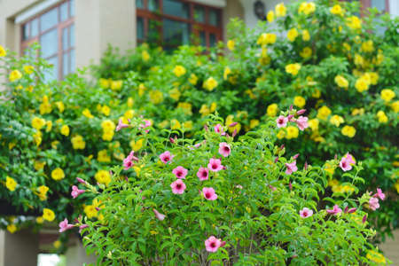 Purple Allamanda cathartica flower brush in front of Golden trumpet flower brush
