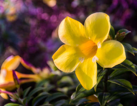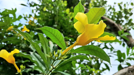 The blooming yellow allamanda cathartica flower in garden with green leaf