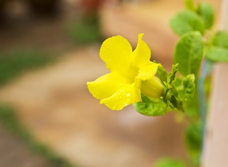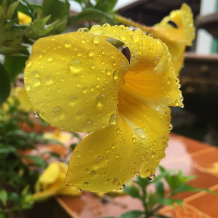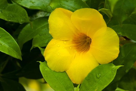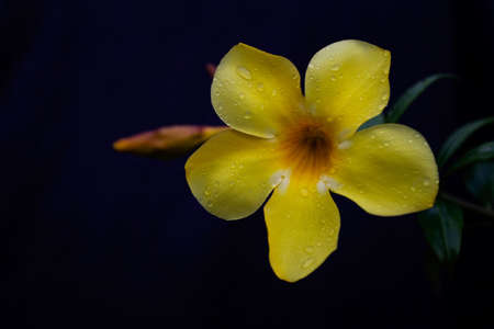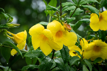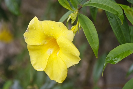 Yellow bell Allamanda cathartica flower, also called golden trumpet flower with raindrops after raining in the springtime.