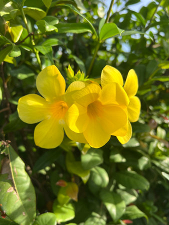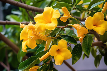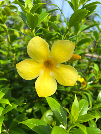 Vibrant Yellow Allamanda Cathartica in Full Bloom, Tropical Ornamental Flower Perfect for Nature Wallpapers, Eco Design Elements, and Garden-Themed Visual Content