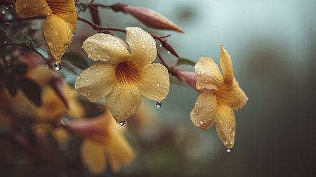 Soft rain falling gently on Thunbergia, with water droplets forming and slowly dripping. The background is softly blurred with a natural, moody atmosphere.