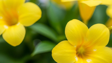 Vibrant yellow Allamanda flowers with delicate petals and green foliage in a soft focus background.