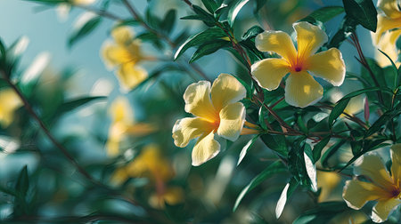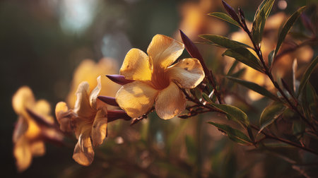 The Allamanda at dawn, soft golden sunlight kissing leaves, clean air, natural color tone.