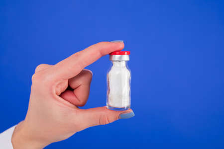Glass vials with vaccine liquid on a blue background. The concept of medicine, vaccination and injection.