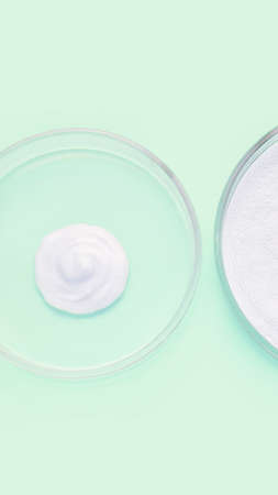 Collagen white powder. Pastel color background. Health product. Woman cosmetics concept. Sport supplement. Skincare cosmetics. Light green. Vertical banner. Cream smear