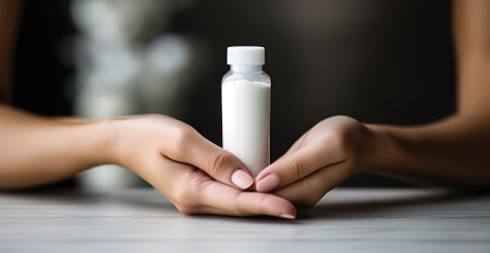 Close-up of a nurse's hand with a bottle of white powder on a blue background