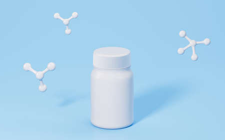 Molecules and medicine bottle with blue background, 3d rendering. Computer digital drawing.