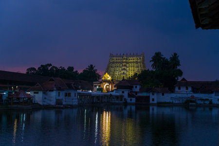 Trivandrum, India - February 28, 2023: The illuminated gopuram of Sree Padmanabhaswamy Temple is visible behind traditional buildings and the sacred temple tank at dusk.