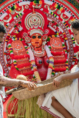 Theyyam artist perform during temple festival in Kannur, Kerala, India.