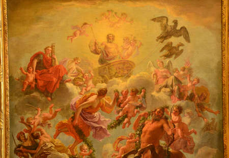Paris, France - August 9, 2017. Sculpture of Mercury riding Pegasus horse in Tuileries Gardens of Paris. Old stone monument of Hermes by Coysevox by twilight.