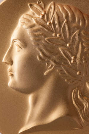 Gypsum copy of ancient statue Venus head on a textured background. Plaster sculpture woman face.