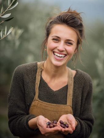 Joyful woman in rustic clothing holding freshly picked olives in an olive tree field