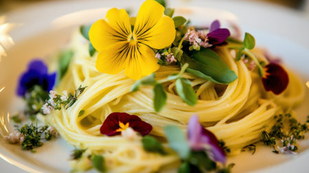 A beautiful serving of spaghetti, adorned with colorful edible flowers and fresh herbs, showcases the art of food presentation and culinary creativity.