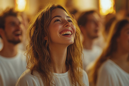 A striking image of passionate vocalists performing in harmony, showcasing emotion and connection, illuminated by stage lights, capturing the essence of live music and community spirit.