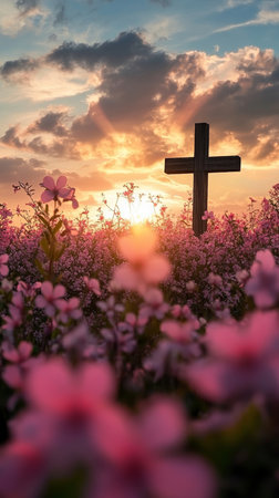 Cross amidst pink flowers at sunset, spiritual serenity concept