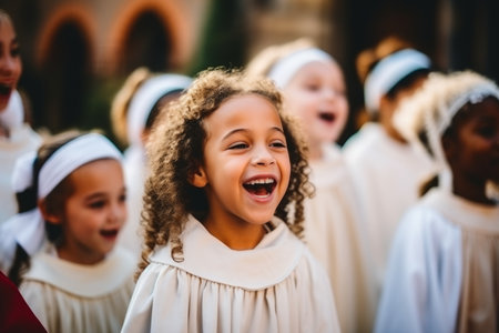 Children choir. Diverse multiethnic group joyful happy cute talented little kids singing together traditional songs music performing concert entertainment holidays tradition celebration indoors church