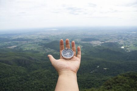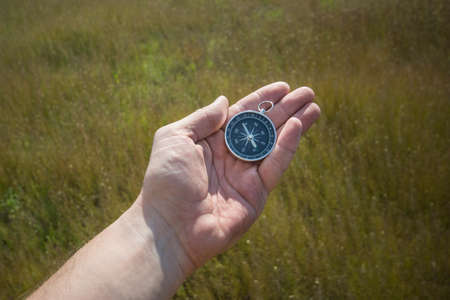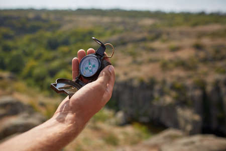 Close up of hand Traveler man with compass on a background of nature, Travel concept, camping trip, GPS, orienteering, navigator