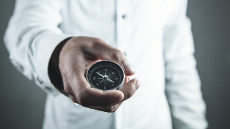 Businessman looking at a compass which he is holding in his hand with focus to the compass