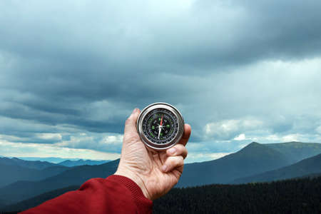 First-person view of a male travelers hand holding a magnetic compass against the backdrop of a mountainous area. Orientation and finding your way