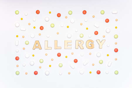 Allergy. Allergens, antihistamine pills, seasonal allergies. Minimal flat lay allergy concept.