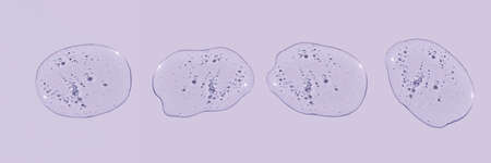 Swatch of cosmetic liquid drops on purple background top view. Skincare product