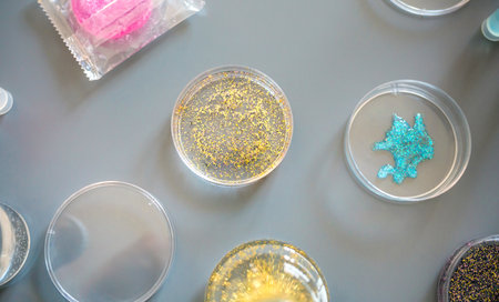 Top view of different glitter samples in petri dishes over a lab table background. Small plastic particles behavior to humans and environment. Concept of European Union ban use of microplastics.