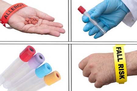 A collage of health care photos Pills, fall risk bracelet, blood viles