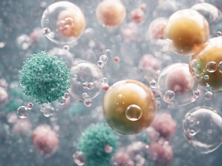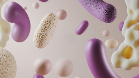Colorful abstract shapes representing microorganisms floating in a soft, light background